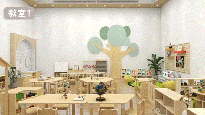 四间教室的设计风格统一但各具特色。角色扮演区、积木区、绘画区、阅读区等各个功能区域自然衔接,形成完整的学习动线。