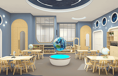 ● 探索科学室:蓝色主调搭配太空元素,沉浸式空间设计激发科学探究兴趣。