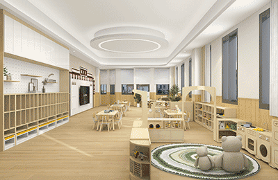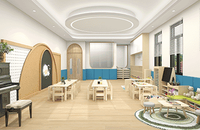 ● “会呼吸”的教室:分龄设计,开放式布局。采用可移动家具,支持场景灵活重构,软包设计、家具圆角设计呵护幼儿安全。