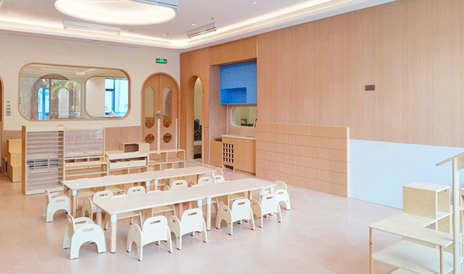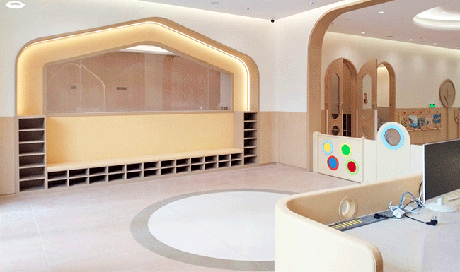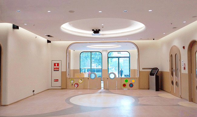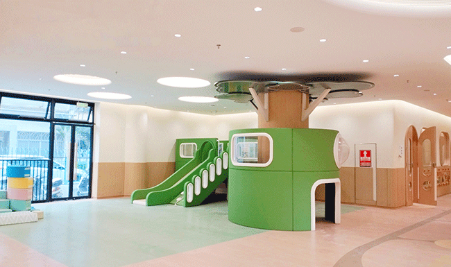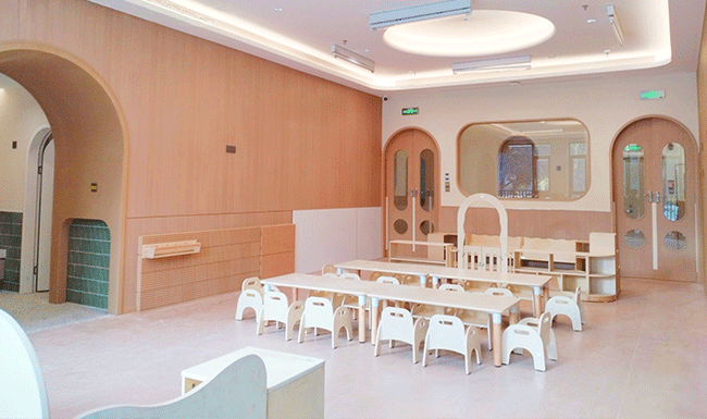 景观式造型的大厅环境,激发幼儿探索欲望;互动体感投屏促进社交与协调;双层互动活动空间鼓励攀爬与触觉发展;每一处空间,皆暗含感统训练巧思。全园1.2米以下全部采用圆角软包墙裙,门缝加装安全防夹手软包,实现无忧探索。